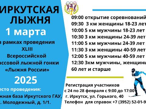 По традиции, гонка пройдет на лыжной базе Иркутского государственного аграрного университета в поселке Молодежный на окраине города. Регистрация участников откроется 24 февраля и закроется вечером 28 февраля в городском управлении по физической культуре, спорту и молодежной политике на улице Горького в доме №40 в Иркутске. Справки по телефону 52-01-98.