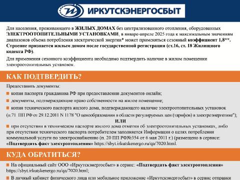 «Иркутскэнергосбыт» разработал упрощенный порядок предоставления документов, подтверждающих наличие электроотопления для жителей, а также доработаны онлайн-сервисы компании для оперативного получения информации: внедрены дополнительные разделы на сайте компании, обновлены Личный кабинет и мобильное приложение. Самый простой способ предоставить сведения — направить документы дистанционно. Например, через сайт «Иркутскэнергосбыта». Это можно сделать через специальный раздел – на главной странице сайта есть вкладка «Подтвердить факт электроотопления». Там же указан перечень документов и образец для заполнения.