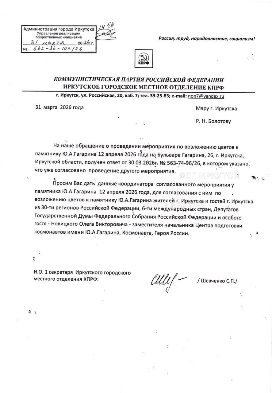 Накануне стало известно, что руководство городского отделения КПРФ обратилось к мэру Иркутска Руслану Болотову с просьбой сообщить данные координатора уже согласованного мэрией мероприятия 12 апреля у памятника Ю.А. Гагарину. Коммунисты хотят договориться с этими прекрасными людьми о проведении церемонии возложения цветов к памятнику гостями и жителями Иркутска.