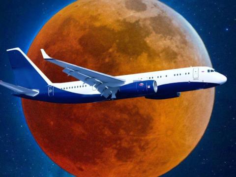 На высоте 10 000 метров участники спецрейса увидели как Луна окрасилась в таинственные багрово-красные тона. Такой эффект возникает из-за преломления солнечных лучей в земной атмосфере.