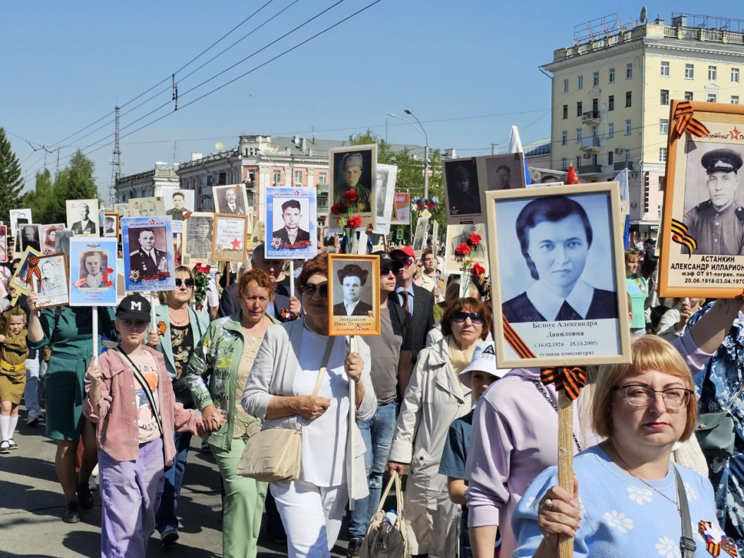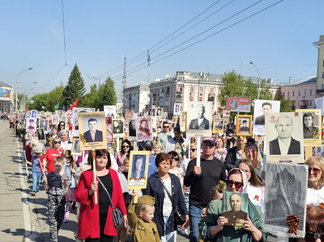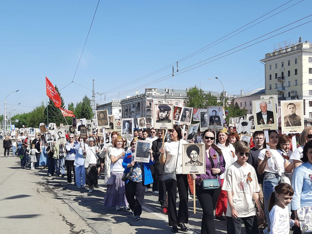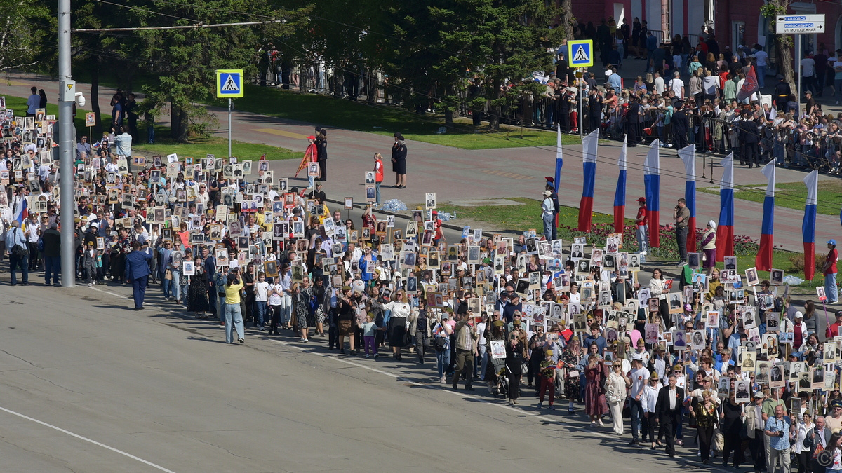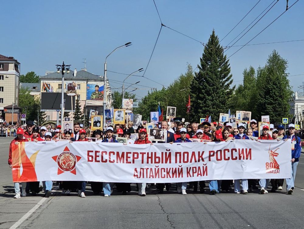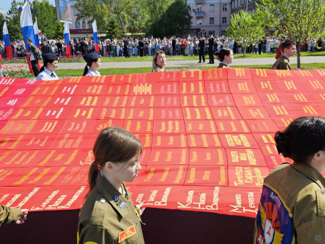 Шествие "Бессмертного полка" открылось выносом знамени Победы длиной 207 метров. Его сшили из 6210 лоскутов, которые прислали жители Алтайского края в рамках межрегиональной акции. Каждый участник акции вышил на своем лоскуте имена членов своей семьи - участников Великой Отечественной войны, специальной военной операции и других локальных вооруженных конфликтов. В результате, получилось полотно длиной 207 метров.