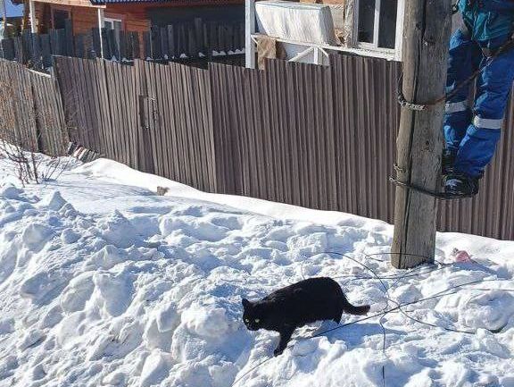 Всё началось с обращения одной из подписчиц соцсетей ИЭСК. В комментариях Дарья написала, что на улице Пограничной в селе Хомутово под Иркутском на опоре уже третьи сутки сидит черный кот. Спустится сам он не может. Похоже, кот забрался на столб, спасаясь от местных собак.