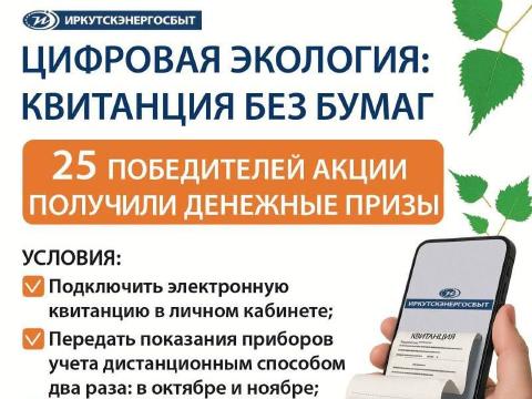 В «Иркутскэнергосбыте» подвели итоги акции «Цифровая экология — квитанция без бумаги», направленной на популяризацию цифровых сервисов компании и заботу об окружающей среде. 25 жителей Иркутской области стали победителями и получили по 2000 рублей на оплату счетов за электроэнергию. Деньги уже зачислены на их счета, причем больше всего победителей оказалось в Зиме.