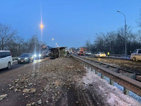 По факту ДТП проводится проверка. Водителя грузовика могут привлечь к административной ответственности сразу по трем статьям КоАП РФ: "Управление транспортным средством при наличии неисправностей, при которых эксплуатация транспортного средства запрещена", "Нарушение правил перевозки грузов" и "Повреждение автомобильных дорог или иных дорожных сооружений либо загрязнение проезжей части, создающее угрозу безопасности дорожного движения". Об этом рассказали в Госавтоинспекции Приморья.