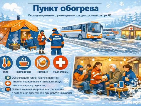 В ведомстве напоминают, что в период экстремально низких температур, в условиях сильных морозов, заторов, метелей силы МЧС вместе с чиновниками работают в усиленном режиме. В пунктах обогрева граждане могут получить теплое питье и питание, медицинскую и психологическую помощь, согреться после длительной поездки.
