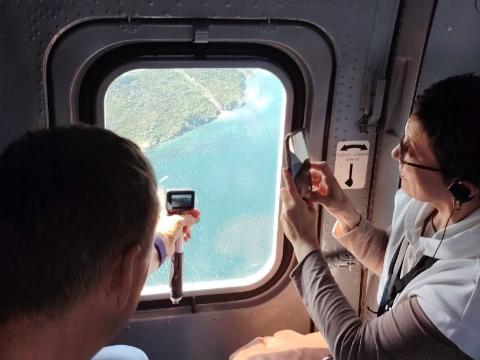 Гидом в первом воздушном путешествии стал один из самых знающих и известных экскурсоводов Колымы Павел Тихменёв. Жители Магадана так удивились событию, что махали руками вертолёту, как будто их наняли организаторы полёта.