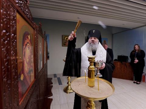 Чин освящения обновленного молитвенного пространства совершил архиепископ Южно-Сахалинской и Курильской епархии Никанор, к обряду присоединились сотрудники аэропорта.