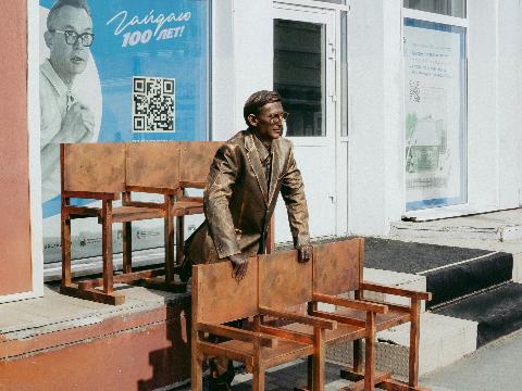 Руководитель организации Юрий Яшников отметил, что в областном центре уже есть прекрасный памятник режиссеру, созданный скульптором Александром Мироновым. Глядя на этот монумент, жители и гости города не всегда задумываются о том, что Гайдай когда-то был простым парнем из Глазково, ходил по тем же улицам, по которым сейчас ходим мы с вами. Кинорежиссер Оксана Цепилова предложила идею этой городской скульптуры. Оксана сослалась на книгу "Гайдай. Иркутские страницы" Владимира Березина, где приведены воспоминания одноклассников режиссера. Оказалось, что юный Гайдай обожал ходить в кинотеатры, которых на улице Карла Маркса было три. Он хотел смотреть фильмы с Чарли Чаплиным снова и снова. Но семейный бюджет не позволял так баловать младшего сына, ему давали лишь 20 копеек на сеанс. Тогда Лёня после окончания сеанса ложился между рядами кресел, чтобы остаться незамеченным для билетера, а как только начинался новый сеанс, поднимался и вновь с замиранием сердца следил за происходящим на экране. Именно эта история легла в основу идеи для скульптуры"Лёня Гайдай в кинотеатре".